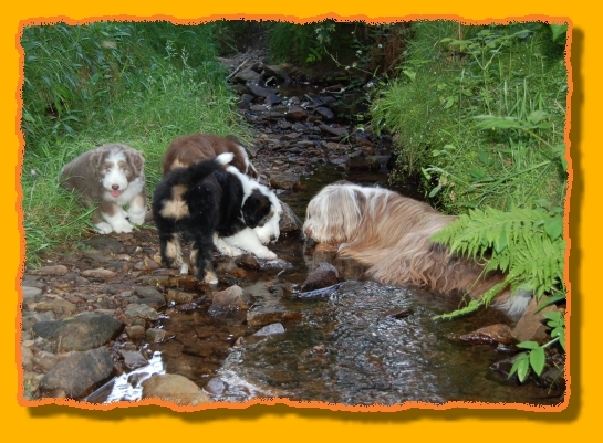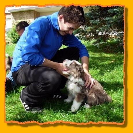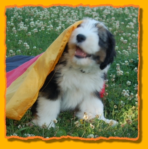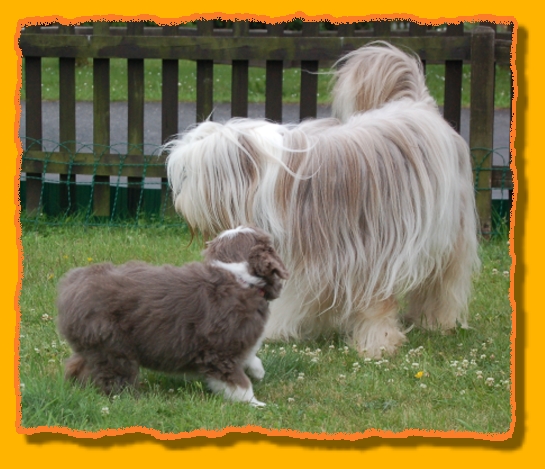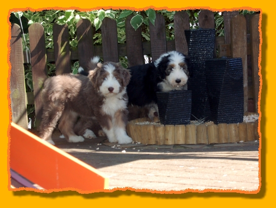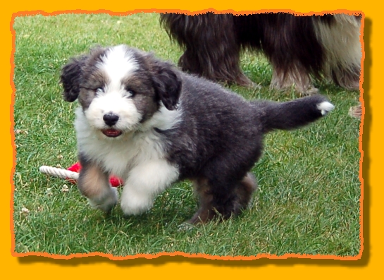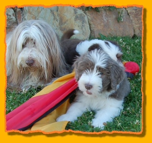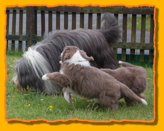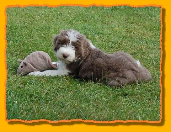 Leider hatten wir Probleme mit dem Computer, und deswegen gibt es erst jetzt die neuen Fotos, sorry!!! Eine ereignisreiche Woche ist für uns und die Kleinen zu Ende gegangen. Der Tierarzt war zum Impfen und Chipen da, was die Jungs wie richtige Jungs weggesteckt haben, und HEAVEN, naja...Der Zuchtwart war zu letzten Wurfabnahme da, und auch Manuela hat ihren bzw. COFFY’s Nachwuchs wieder besucht. Ausflüge in die nähere Umgebung, eine schöne Autofahrt zu unseren Freunden Karola, Volker und Onkel BALOU in den grossen Garten, stand ebenso auf dem Programm, wie fleissiges an der Leine gehen üben. MIRO und ELVIS haben uns besucht, wobei die Kleinen sicherlich dabei mehr Spass hatten! Die letzten acht Wochen sind so schnell vorüber gegangen, und der Abschied von unserem Sextett bzw. Quintett steht bevor. HEAVEN wird ja bei uns bleiben, und ich freue mich riesig, das BANDIT zu unseren Freunden Anja und Sascha und seinem Halbbruder SUNNY nach Gummersbach zieht. BANDIT bleibt in meinem Besitz, und ich hoffe er wird mal genauso ein Prachtkerl wie sein Papa COFFY! Zu unserer Freude zieht das erste Mal ein kleiner Beardie aus unserer Zucht ins Ausland (Luxembourg). Wir wünschen Lauriane und JOKER viel Spass miteinander, ihr habt euch gesucht und gefunden! JAMMY, JORDAN und PAULCHEN werden uns erst später verlassen, so kann ich die schöne Zeit mit ihnen noch etwas länger geniessen. So, nun aber genug erzählt, jetzt gibt es endlich neue Bilder.