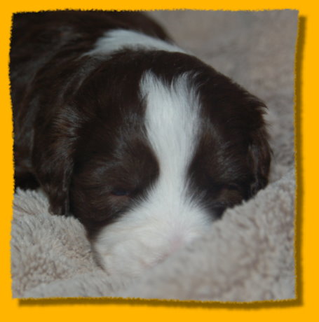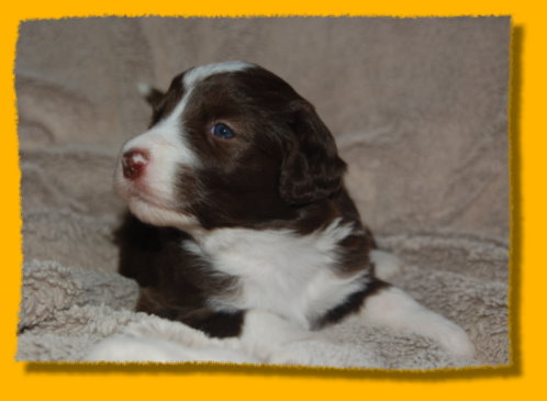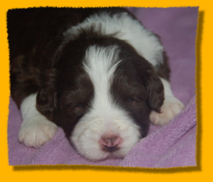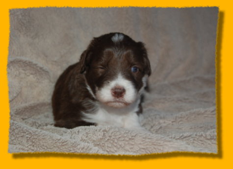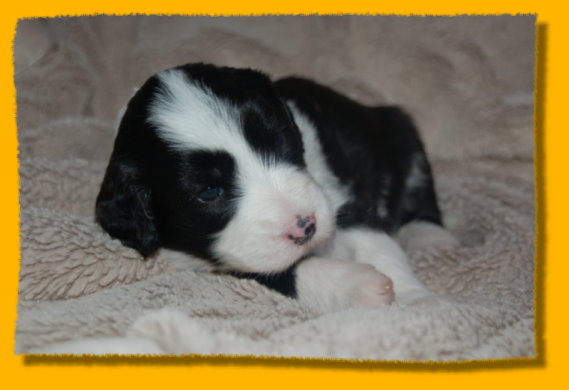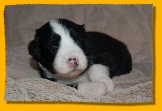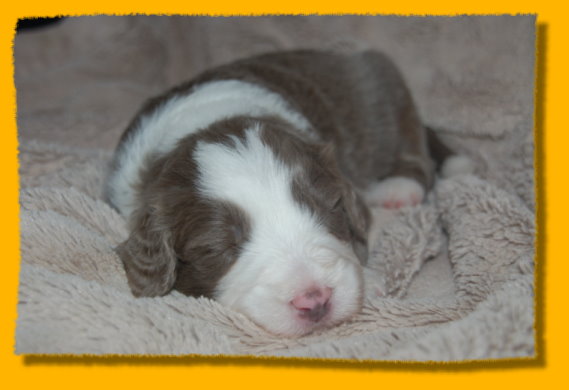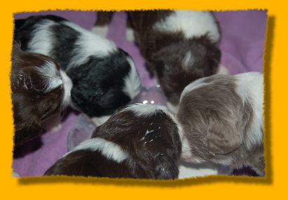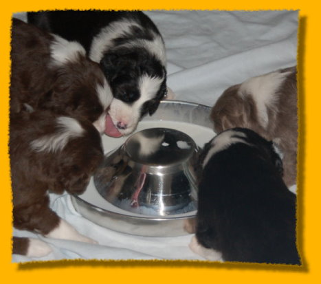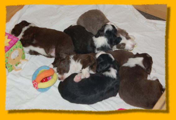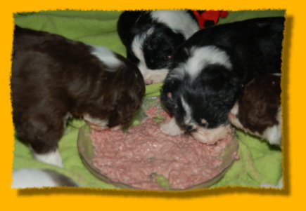 Unser süsses Sixpack ist nun schon drei Wochen alt - man glaubt es kaum. Sie haben sich toll entwickelt und es macht einfach Riesenspass, sie bei ihrer rasanten Entwicklung zu beobachten. Sie sind äußerst unternehmungslustig und erkunden ihre Umgebung neugierig. Mit der abendlichen Zufütterung haben wir auch begonnen - am Anfang war das ein ganz schöne Breischlacht. Mercy kümmert sich nach wie vor rührend um ihre Babies und mag es gar nicht wenn sie mal quietschen... dann wird sofort nachgeschaut ob alles okay ist. Oma Heaven darf nun immer ganz dicht bei den Welpen sein und liegt häufig mit neben der nun vergrößerten Welpenkiste.